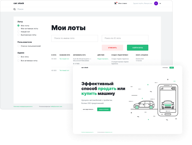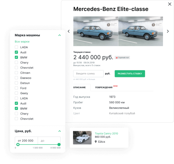 Понятная и удобная витрина автомобилей. У каждого авто есть подробные фото (внешний вид, повреждения), детальное описание, карта повреждений и возможность загружать дополнительные файлы. Фильтр, как правило, настроен для по марке, цене, городу.