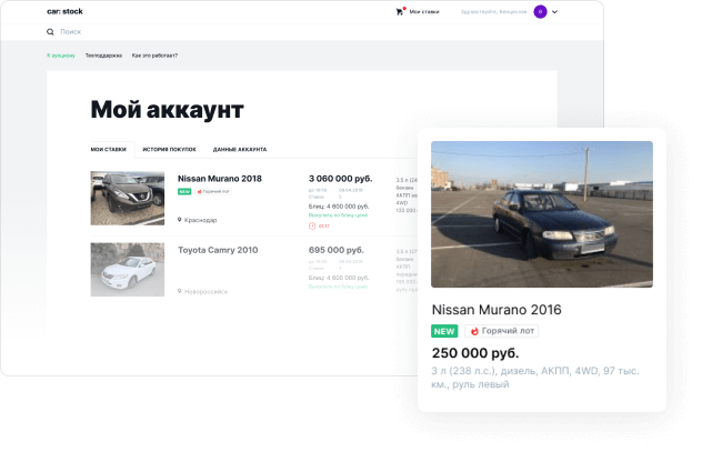 Мы реализовали необходимый набор для клиента: данные аккаунта, мои ставки, история покупок